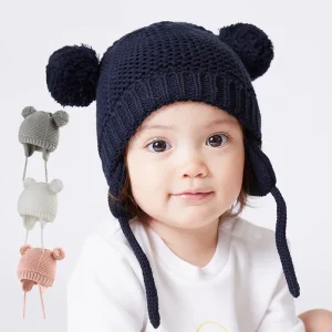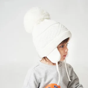 Bonnet gros pompon tricoté en coton avec oreillettes pour bébé