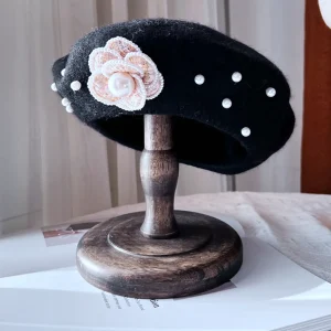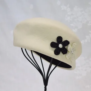 Béret en feutre de laine à fleurs perlées