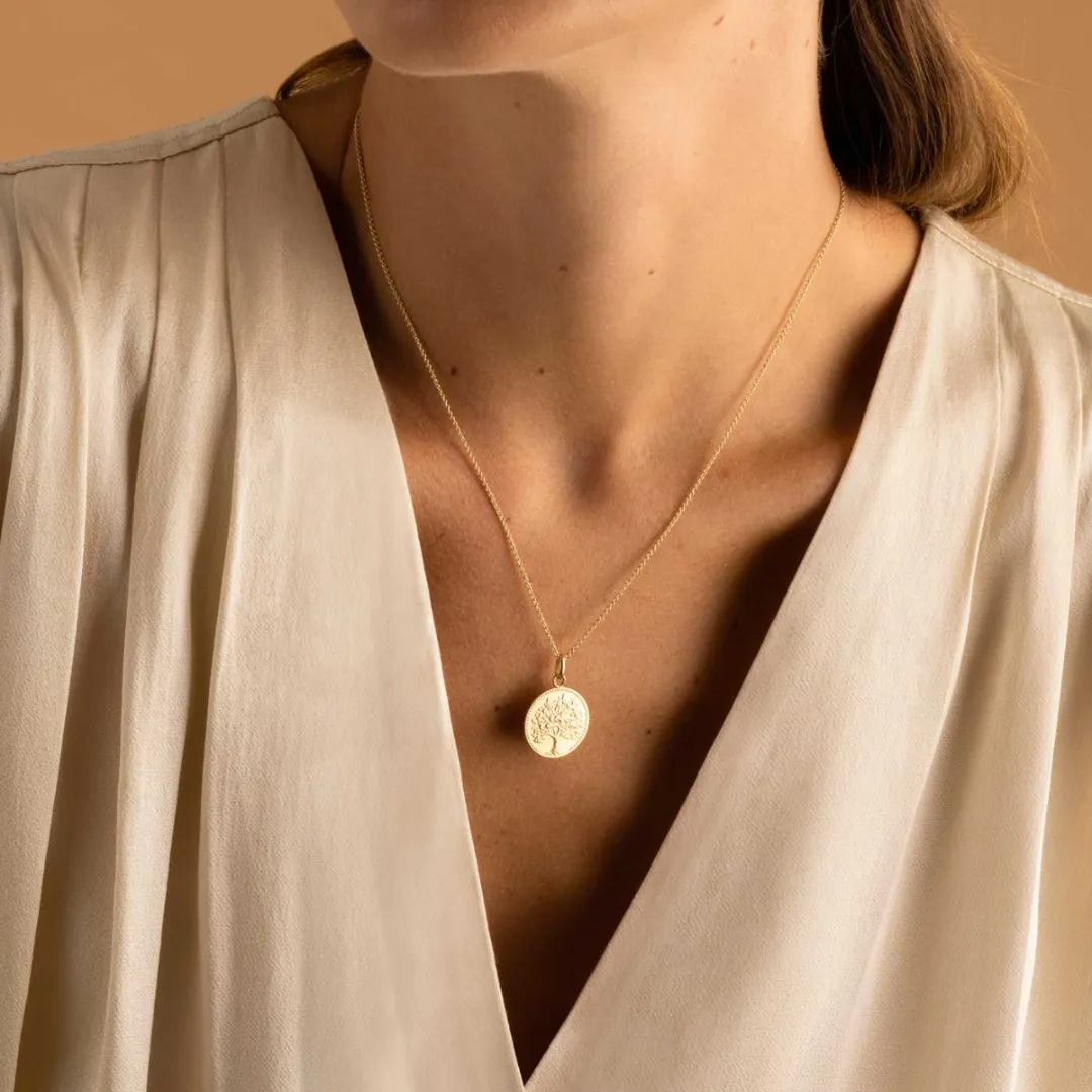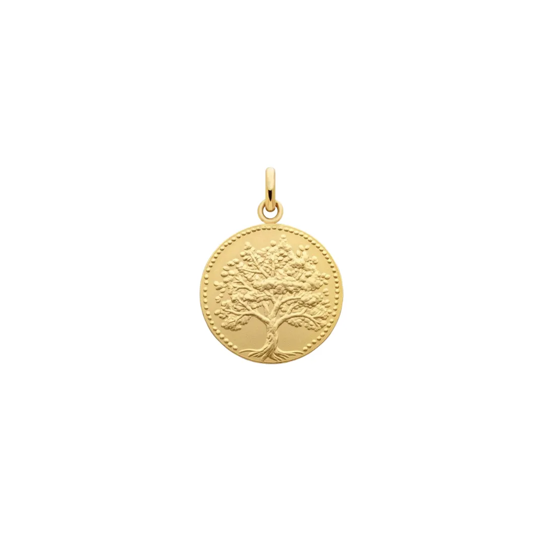 Inspirée du symbole de la renaissance, cette médaille en or 750/000 représente un Arbre de vie. Ce bijou, accompagné d’une finition sablé, incarne l’harmonie entre la vie terrestre et spirituelle. Les racines profondes et les branches qui s’élancent symbolisent le cycle éternel de la vie, présent dans toutes les cultures. Ornée de délicates perles d’or sur le pourtour, cette pièce unique allie style naturaliste et romantisme.