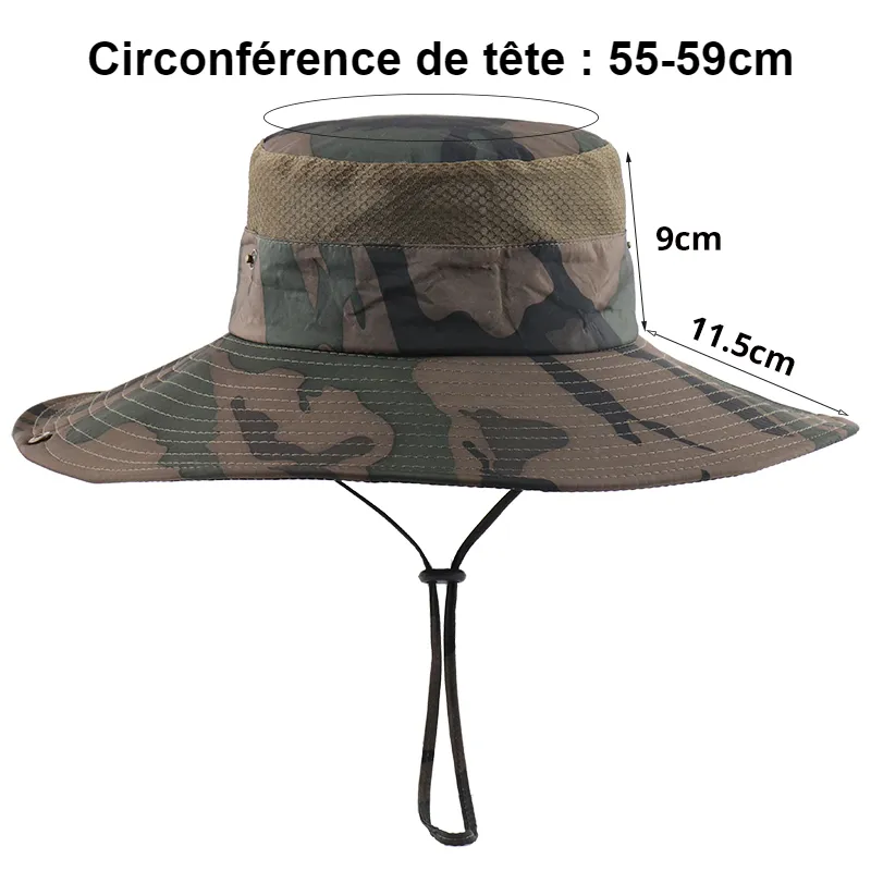 Ce chapeau bob à large bord (11,5cm) est conçu pour être waterproof et avoir un séchage rapide. Son large bord offre une protection solaire optimale pour les saisons printemps/été. Les mailles d’aérations en haut de la couronne permettent une excellente ventilation. Sa taille unique adulte s’adapte à la plupart des circonférences de tête (55-58cm). Ce chapeau possède 2 cordons de serrage réglables pour un bon maintien sur la tête ou pour le garder sur le dos. Ce couvre-chef sera l’accessoire idéal pour des activités de pêche, camping, randonnée…