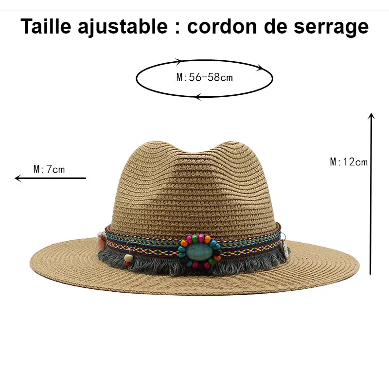 Ce chapeau de paille Panama en paille Jivaro est l’accessoire idéal de plage et de randonnées d’été. Son tissage ajouré apporte un minimum d’ombrage au profit d’une bonne aération. Grâce à un cordon de serrage la taille peut s’adapter à toutes les circonférences de têtes (55-58cm). Le galon de style indien Jivaro qui entoure la couronne offre une belle dose d’exotisme au look estival et aventurier du chapeau.
