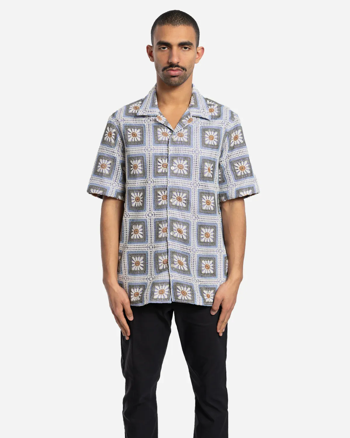 Chemise réalisée en crochet de polyester. Conçue avec un col ouvert et surmontée de boutons en nacre.