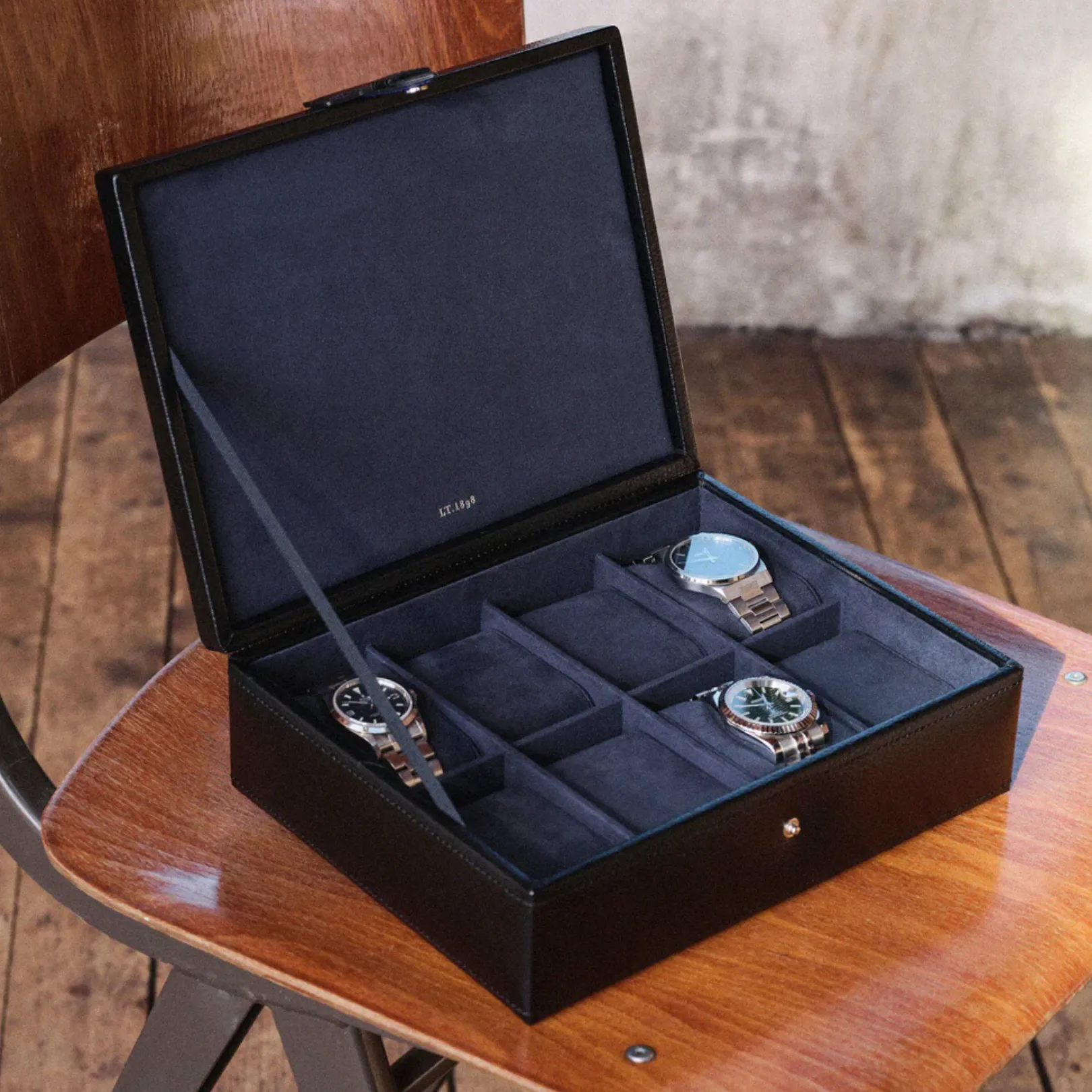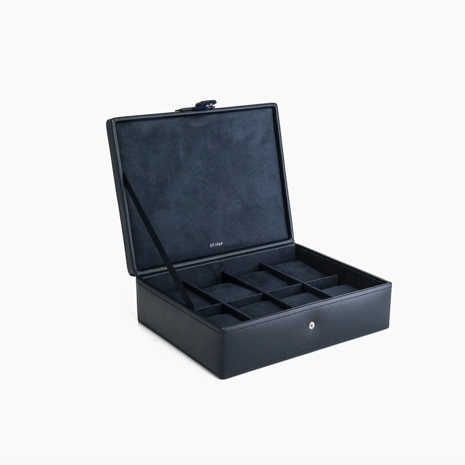 Ce coffret Le Tanneur est conçu pour abriter jusqu’à huit montres. Son intérieur, délicatement doublé de velours bleu, protège chaque montre tout en les mettant en valeur avec élégance. Les compartiments bien agencés assurent un rangement optimal et sécurisé. Ce modèle, à la fois pratique et raffiné, existe également en bleu. Idéal pour les amateurs de montres, il offre une solution de rangement à la fois fonctionnelle et esthétique.