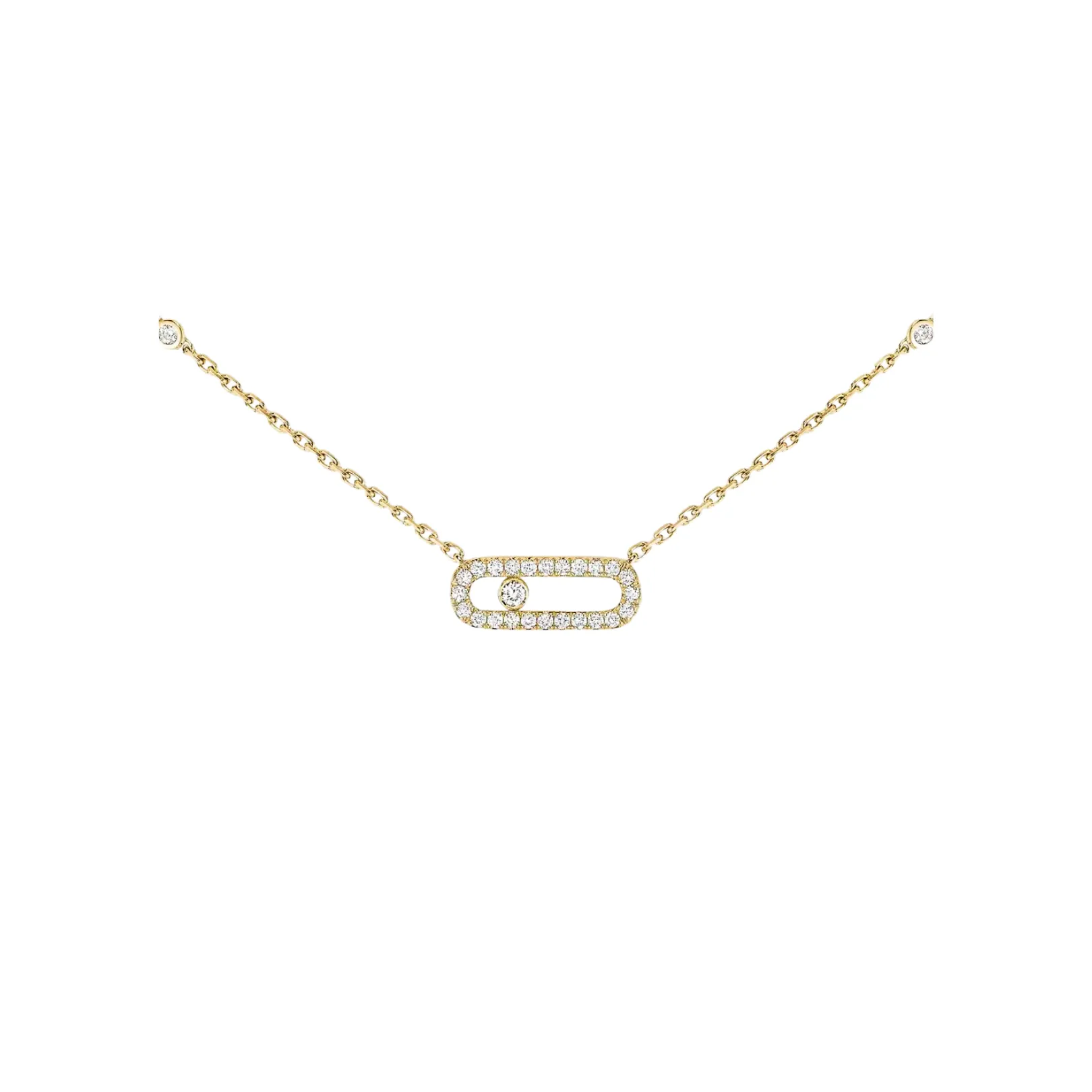Entièrement façonné à la main, le collier Move Uno Pavé se distingue par son design signature Move, où un diamant en mouvement glisse librement au cœur d’un pavage éclatant. Sa chaîne délicate, rehaussée de diamants sertis, sublime l’intensité solaire de l’or jaune. À la fois discret et sophistiqué, cette création signée Messika allie la finesse du sertissage à l’éclat intemporel du diamant.