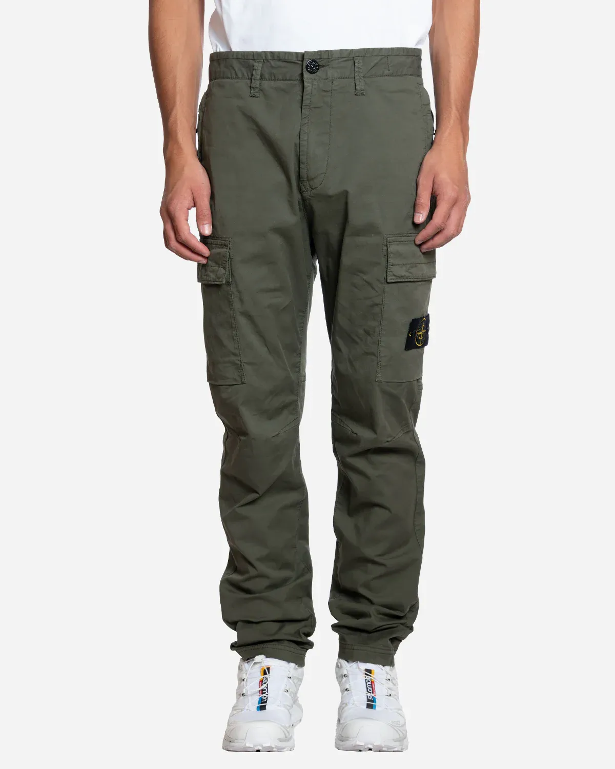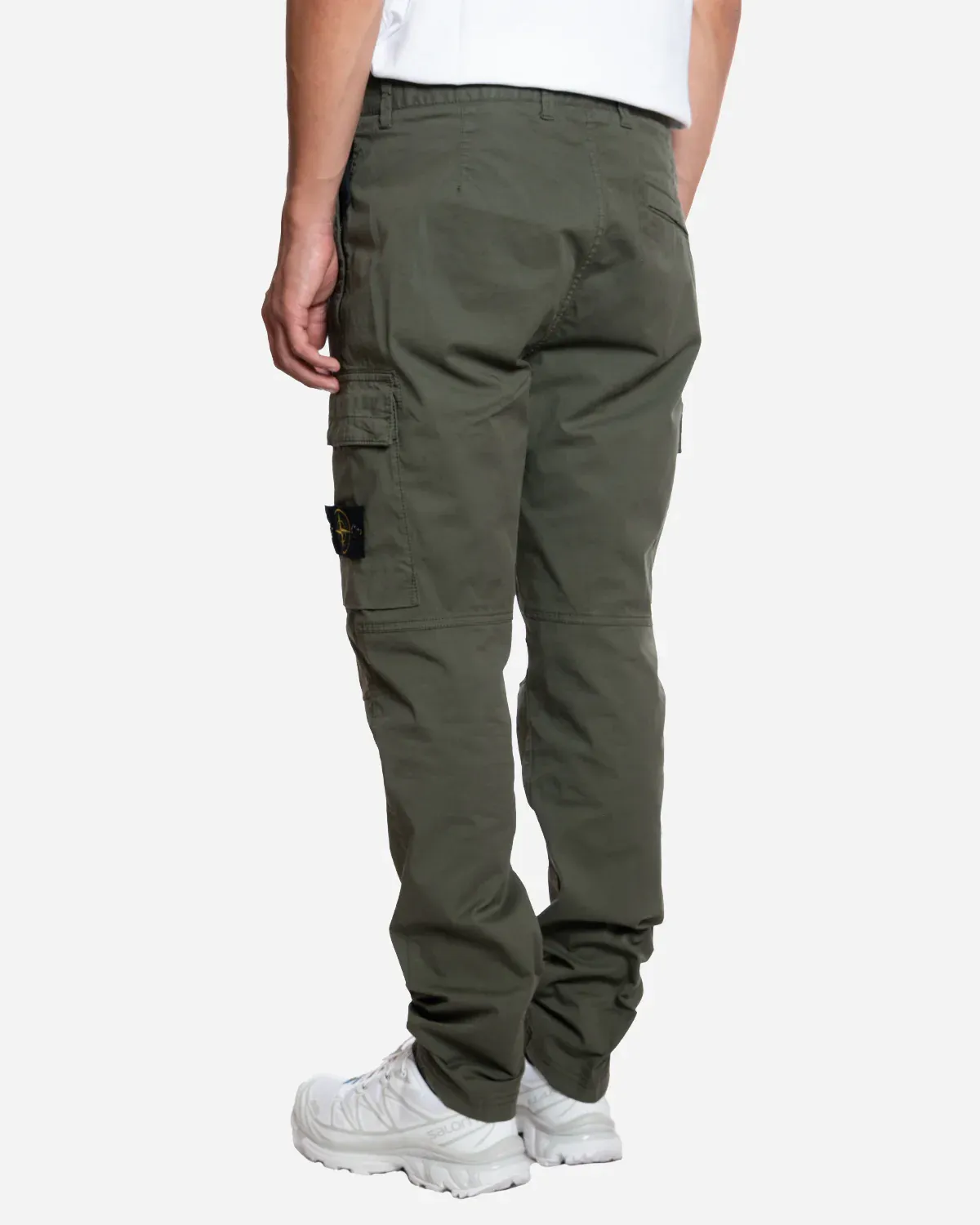 Pantalon cargo en légère toile de coton stretch. Modèle teint en pièce. Coupe fuselée classique. Poches passepoilées avec fermeture zippée dissimulée. Poche arrière avec bouton-pression dissimulé. Poche à soufflet sur les jambes, avec rabat à boutons-pression dissimulés ; la poche gauche est ornée du badge Stone Island. Genoux préformés. Bas de jambe élastique. Taille élastique avec cordon de serrage à l’intérieur. Fermeture zippée.