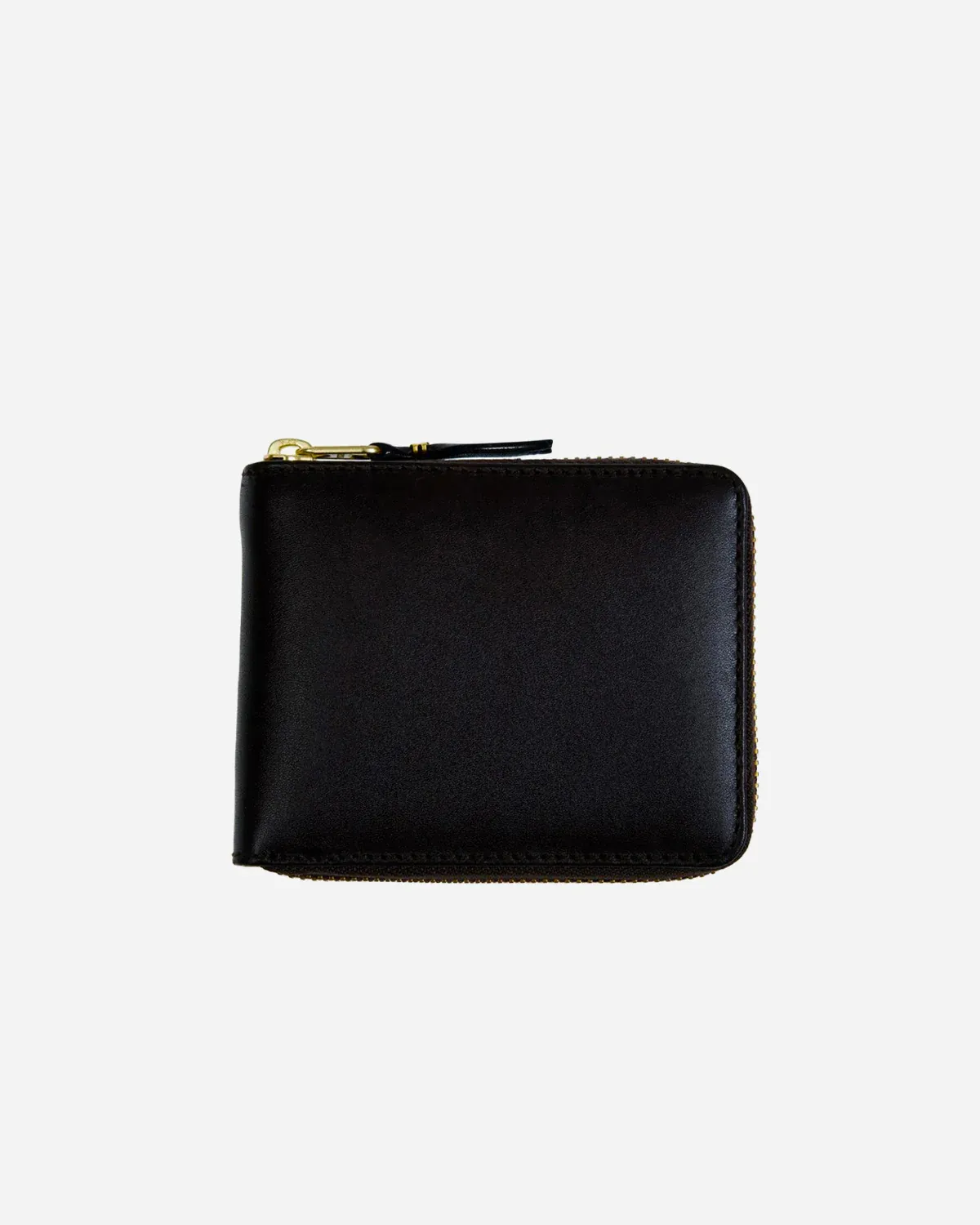 Portefeuille, cuir, CDG, fermeture éclair de couleur or, logo Comme des Garcons doré en relief.
