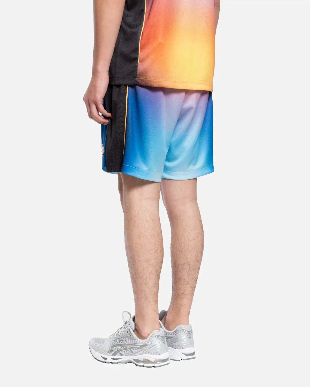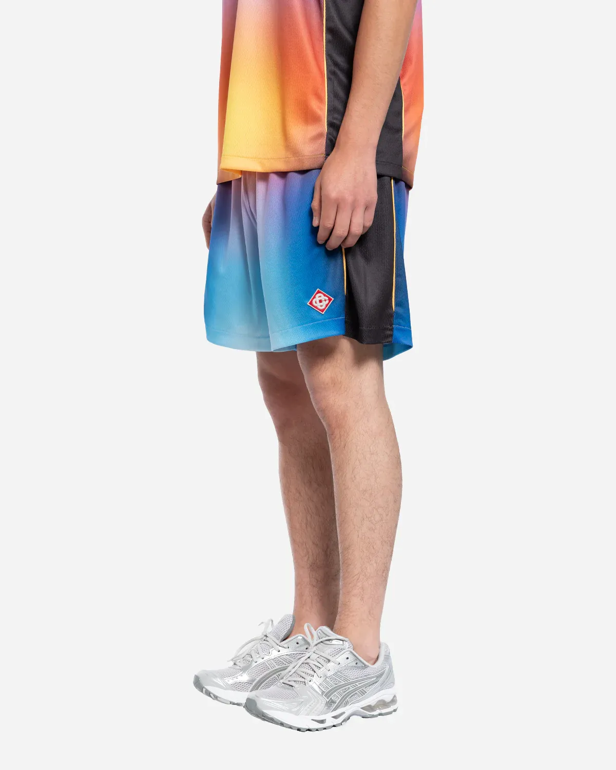 Le short de football dégradé est un modèle de style sportswear confectionné à partir d’un tissu imprimé dégradé incorporant le logo Casablanca emblématique de la maison sur le côté. Il est doté d’une ceinture élastiquée avec cordon de serrage et de poches latérales dans les coutures.