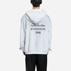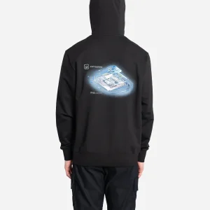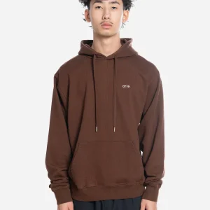 Sweat-shirt en molleton de coton biologique avec capuche à cordon de serrage, poches plaquées, coutures surjetées et détail de lunette sous l’encolure arrière. Modèle teint en pièce.