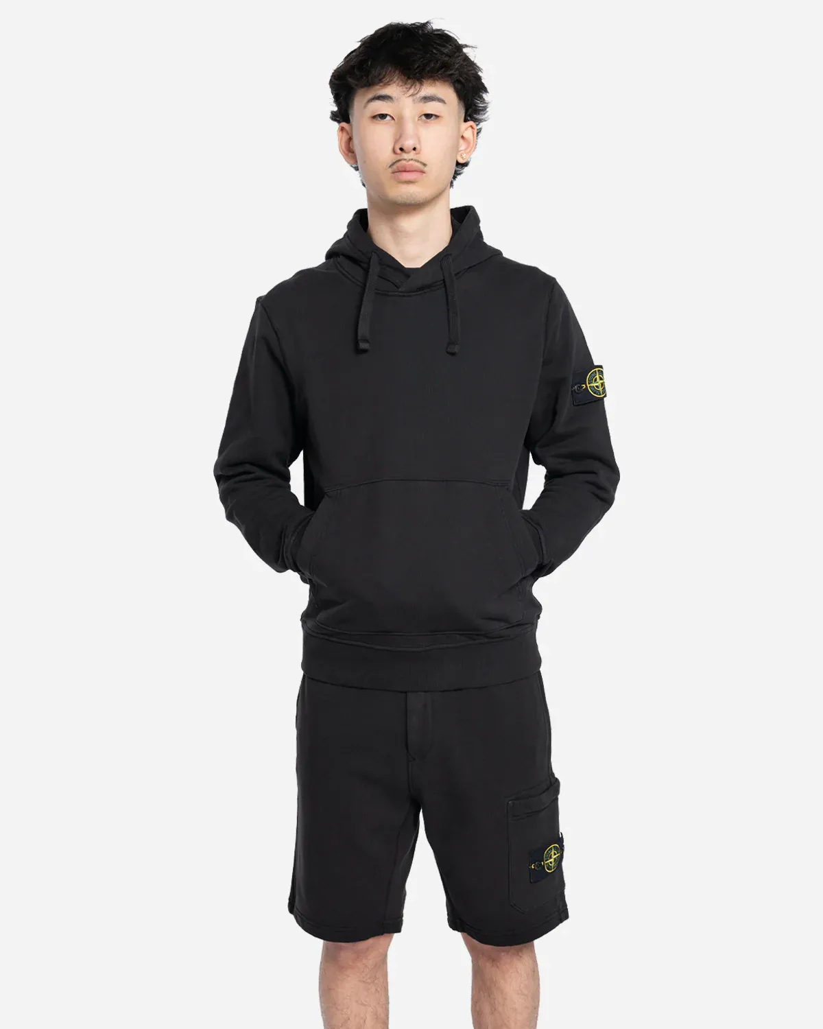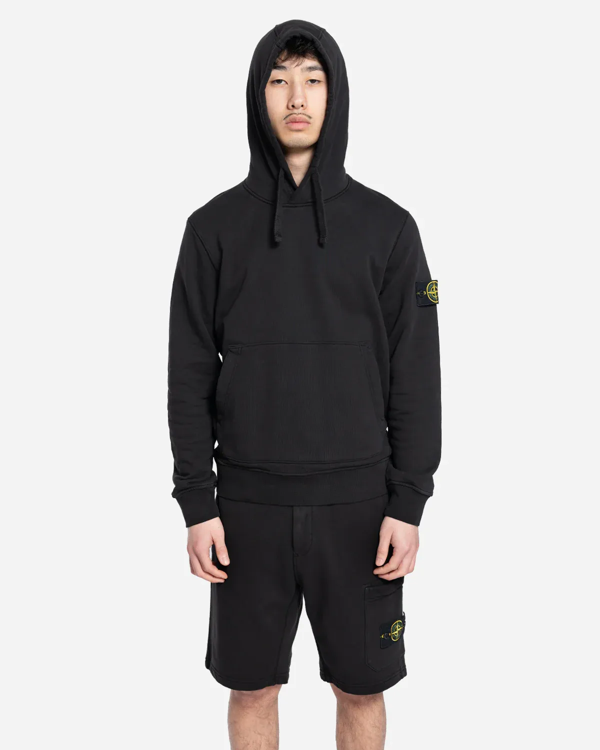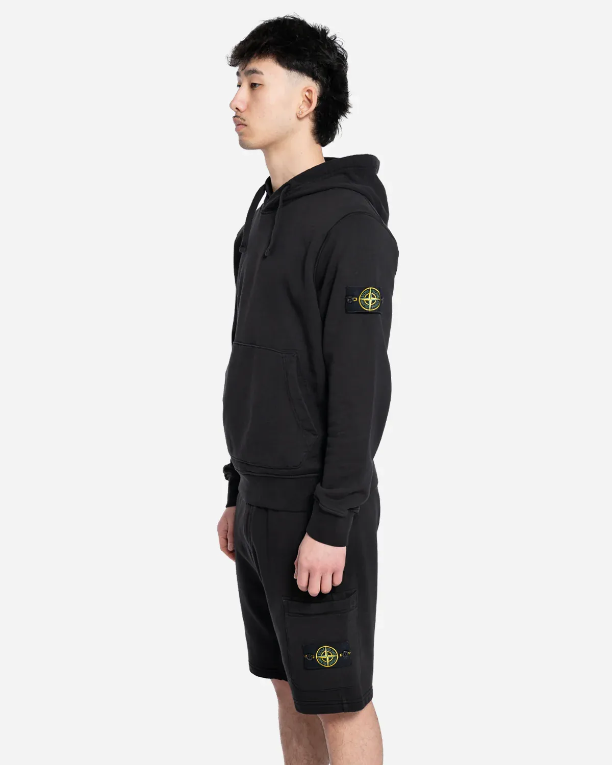 Sweat-shirt en molleton de coton biologique avec capuche à cordon de serrage, poches plaquées, coutures surjetées et détail de lunette sous l’encolure arrière. Modèle teint en pièce.