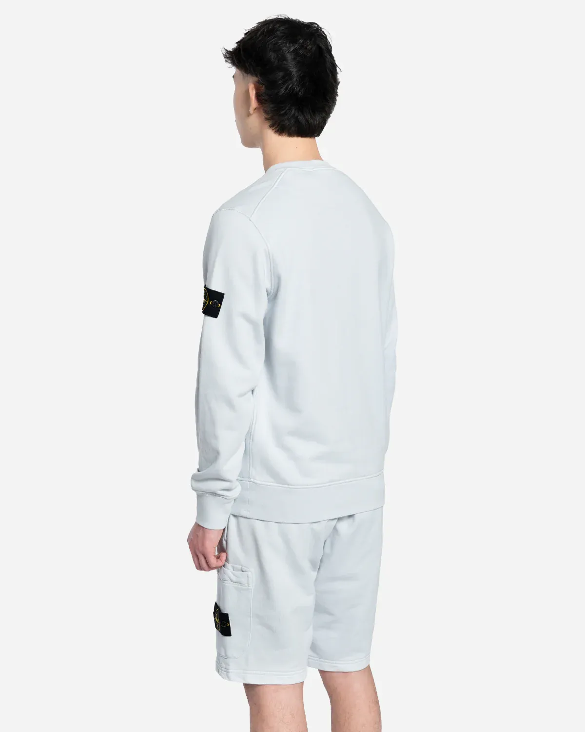 Sweat-shirt ras-du-cou en molleton de coton biologique avec encolure côtelée, coutures surjetées. Modèle teint en pièce.