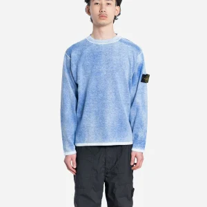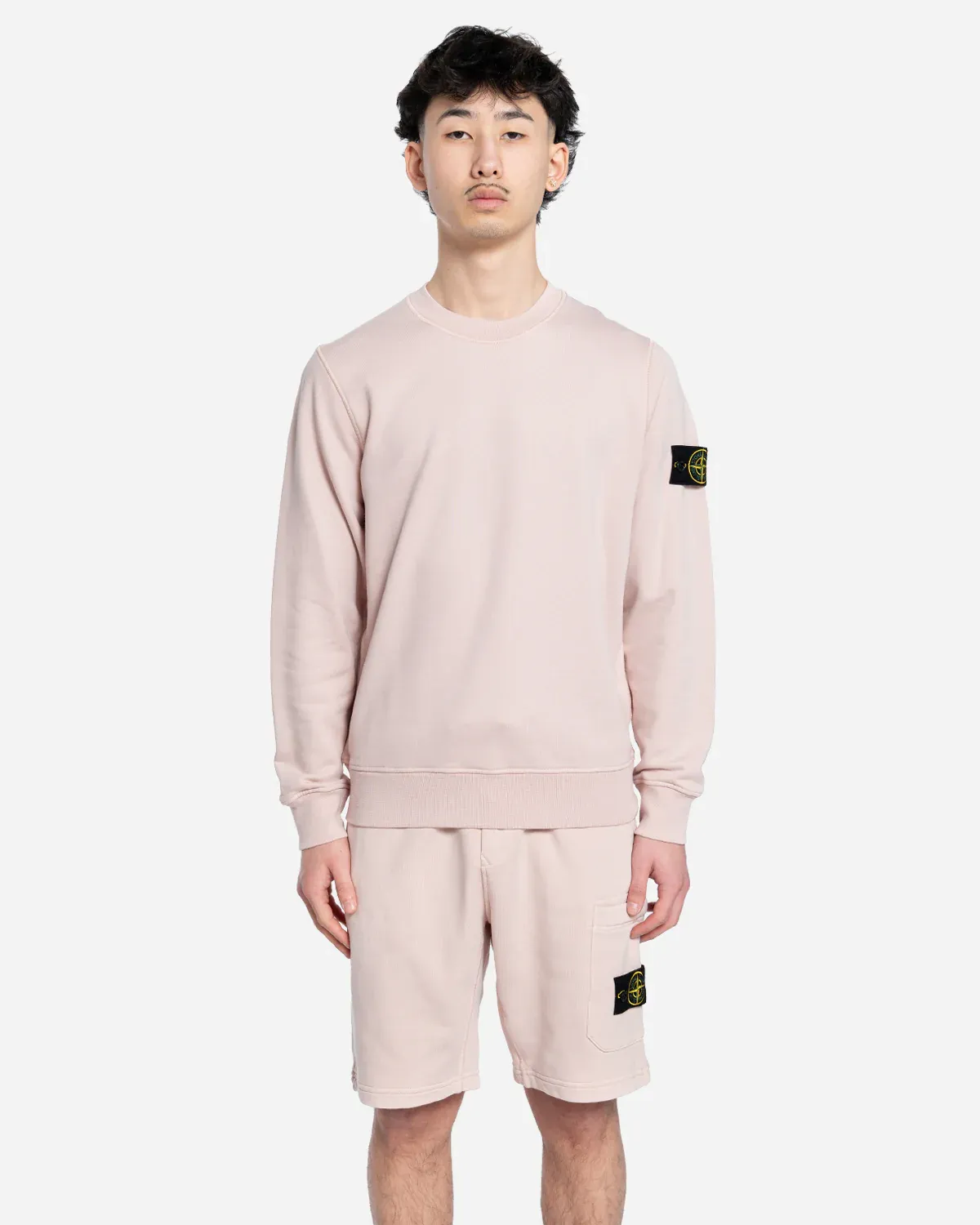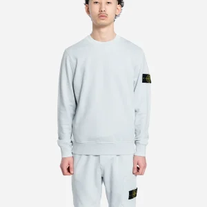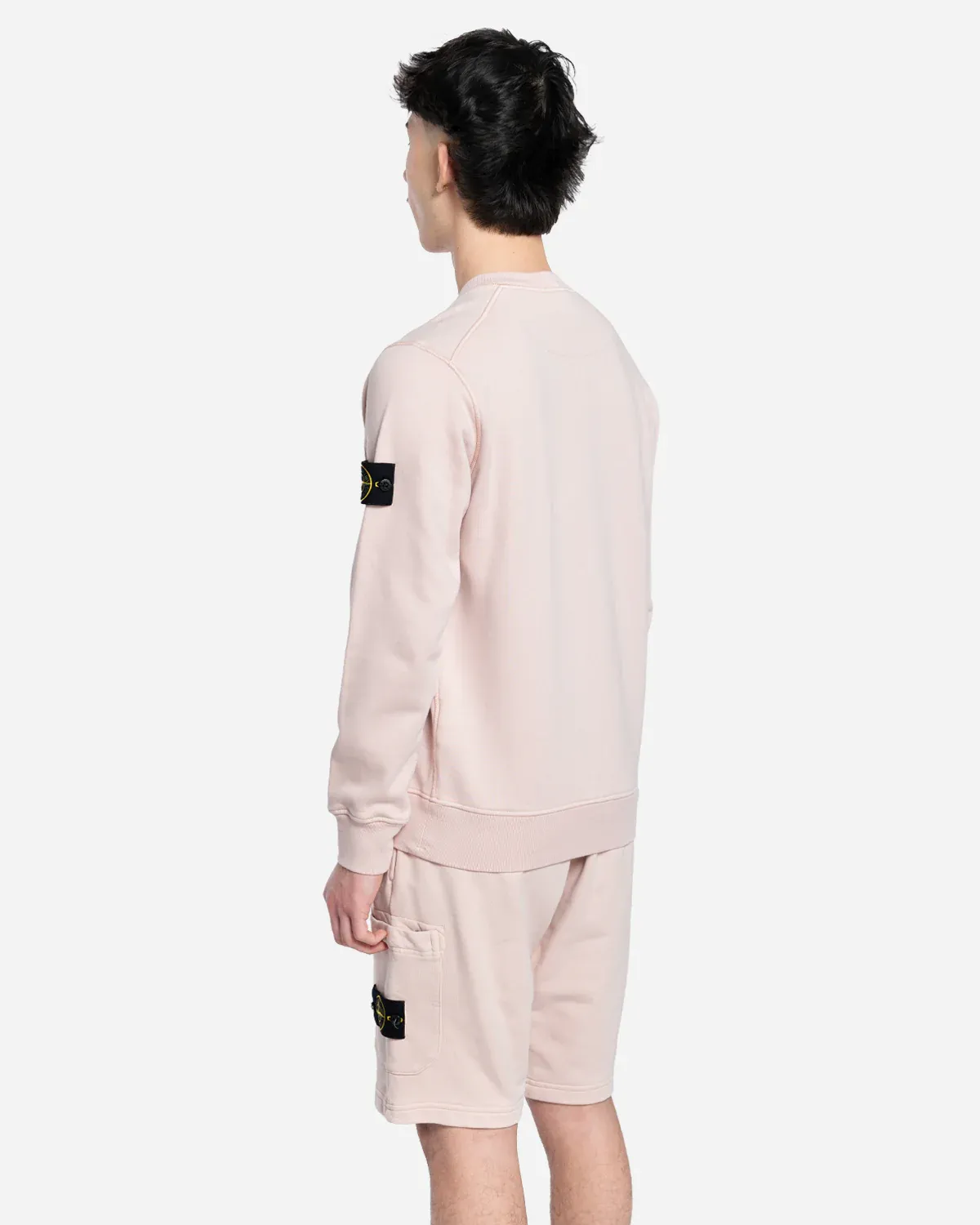 Sweat-shirt ras-du-cou en molleton de coton biologique avec encolure côtelée, coutures surjetées et détail de lunette sous l’encolure arrière. Modèle teint en pièce.