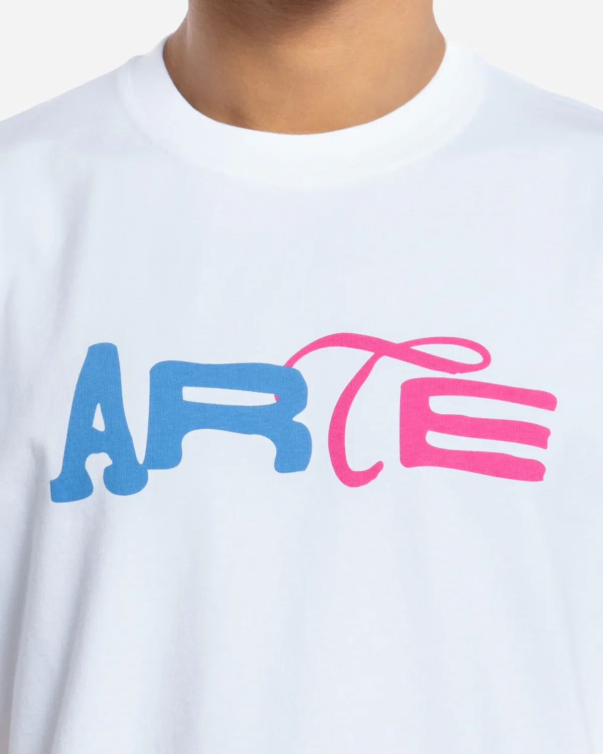 Le T-shirt présente un motif bleu-rose sérigraphié sur la poitrine qui reprend le thème de la collection. Fabriqué en coton épais de première qualité, ce T-shirt blanc est doux au toucher, avec une encolure légèrement plus haute et une coupe décontractée.